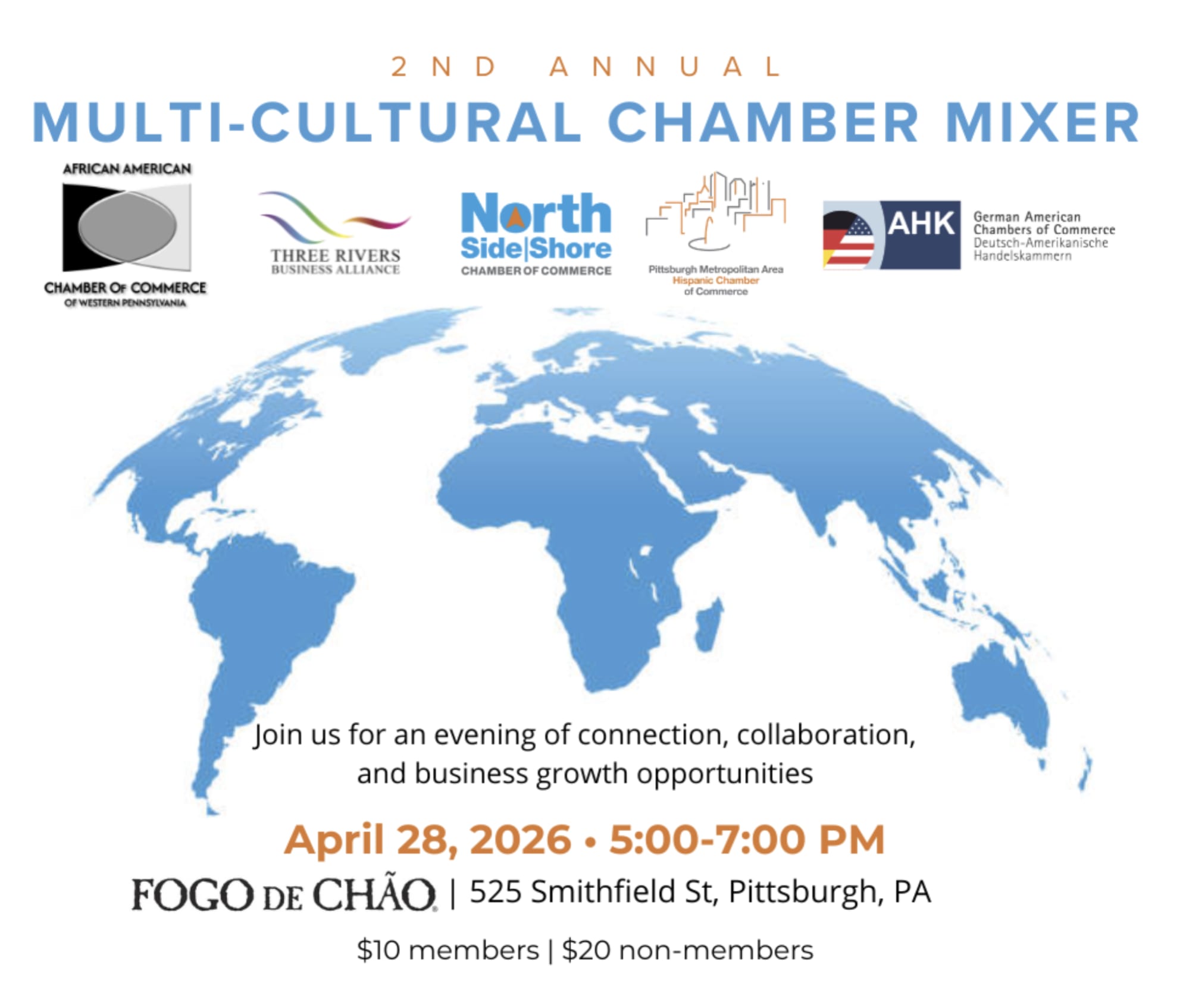 Join us for the second annual Multi-Cultural Chamber Networking Event! -3RBA-African American Chamber of Commerce of Western Pennsylvania-German American Chamber of Commerce-North Side Chamber of Commerce -Pittsburgh Metropolitan Area Hispanic Chamber of Commerce Will all be there for a night of networking! Complimentary appetizers and cash bar for attendees. Registration is required online.